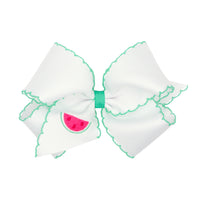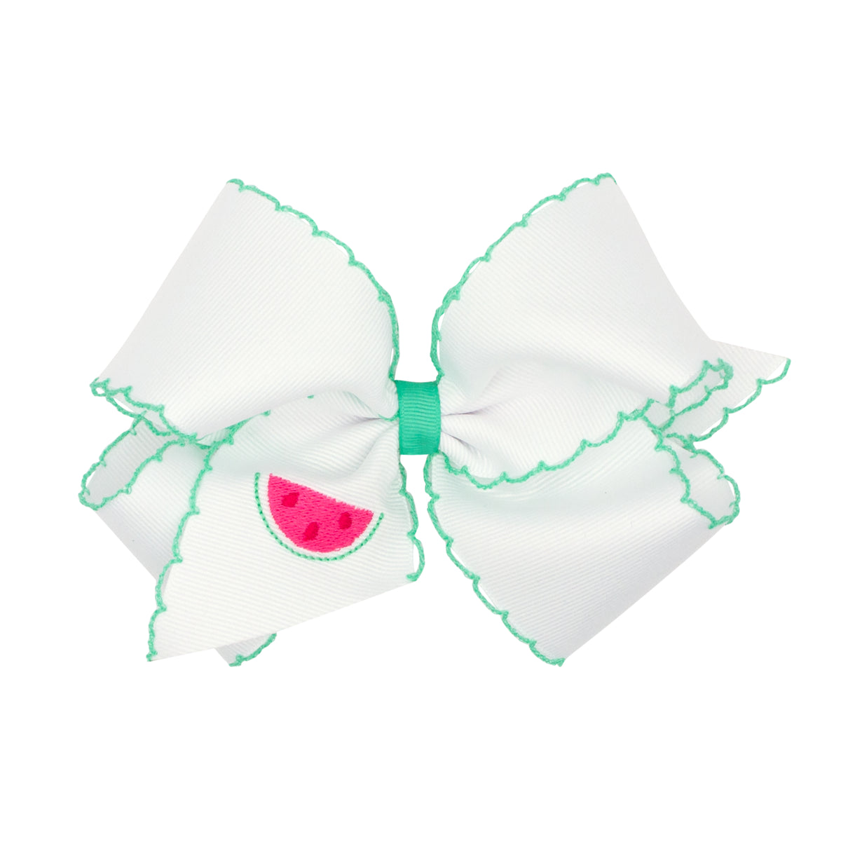 This white grosgrain bow features watermelon embroidery and a moonstitch edge. This bow is sure to stay all day with the Wee Ones patented WeeStay™ no-slip hair clip.