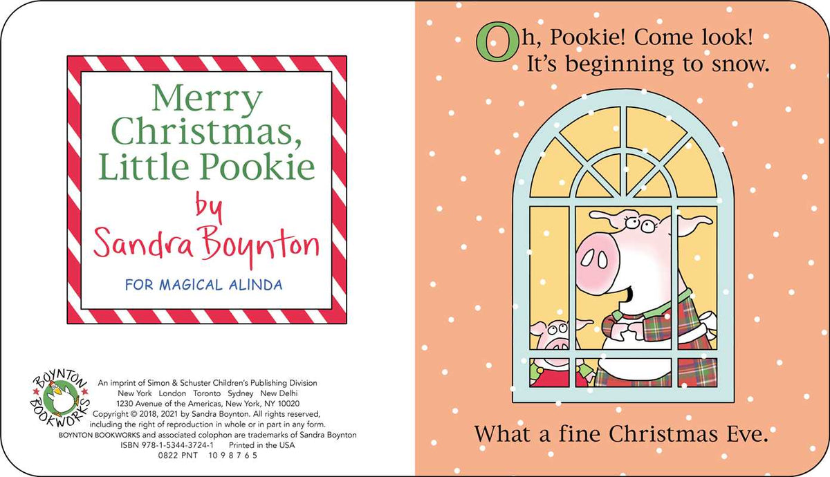 It’s Christmas Eve! Join Mom and her little Pookie as they bake cookies, decorate the house, sing with friends and family—and at last settle down to sleep. Told and illustrated with Sandra Boynton’s celebrated charm and pizzazz, Merry Christmas, Little Pookie is a classic holiday tale.