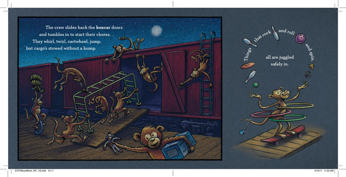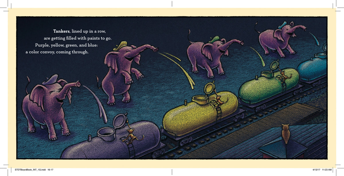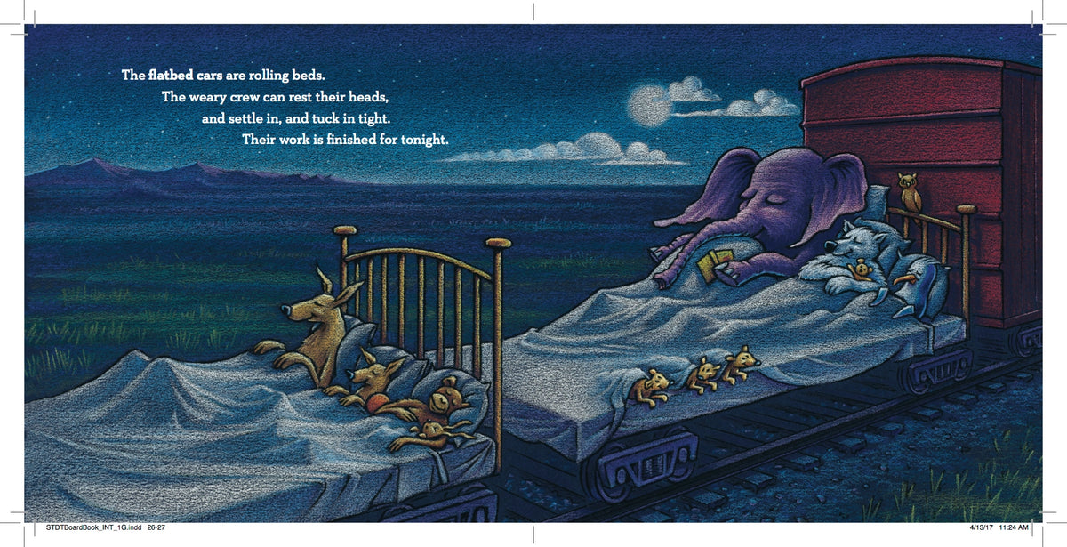 The dream train pulls into the station, and one by one the train cars are loaded: polar bears pack the reefer car with ice cream, elephants fill the tanker cars with paints, tortoises stock the auto rack with race cars, and kangaroos stuff the hopper car with balls (while zebras referee) before settling in for a good night’s sleep.